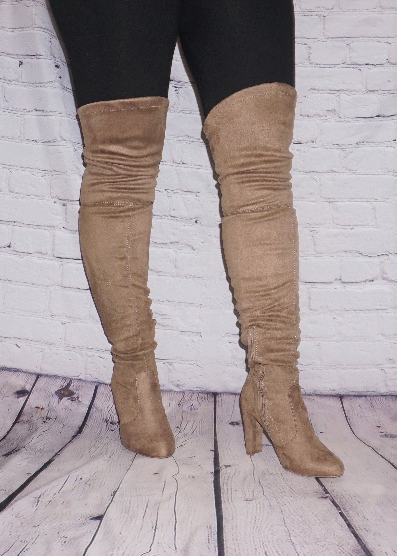 Heel Height Approx: 4.25" True to Size PRODUCT DETAILS Pull on Style Stretchy material Faux-suede Chunky Heel Lightly Padded Insole Taupe over the knee Boot