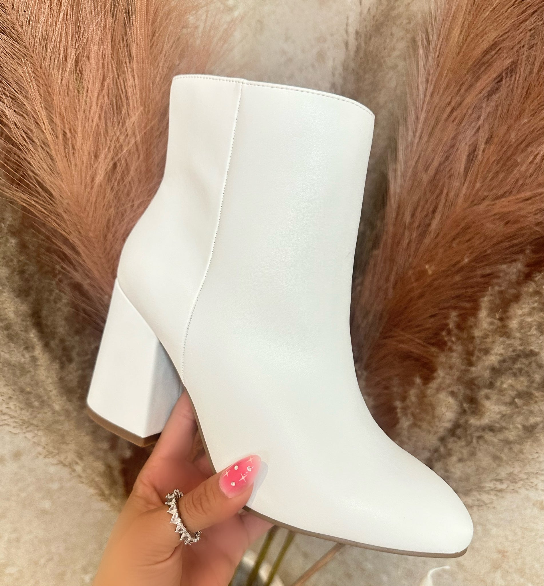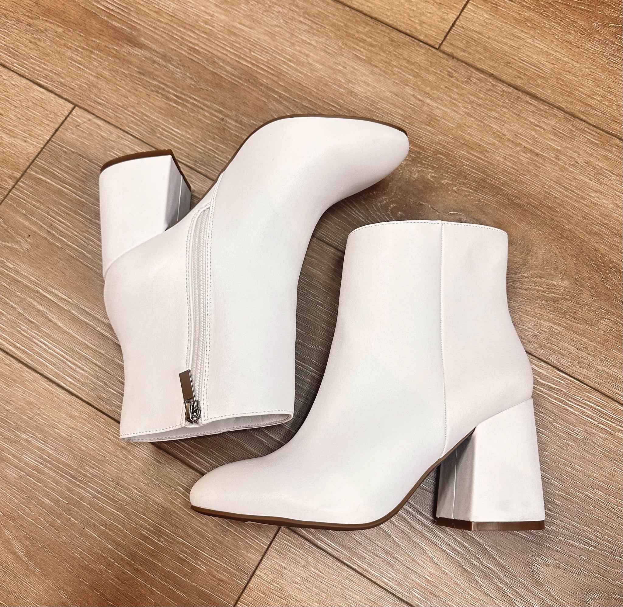 The Bobbie Boot features a stylish square heel of approximately 3.5 inches, providing both comfort and a chic look. With its convenient side zipper, these white boots are a must-have addition to any fashionable wardrobe.