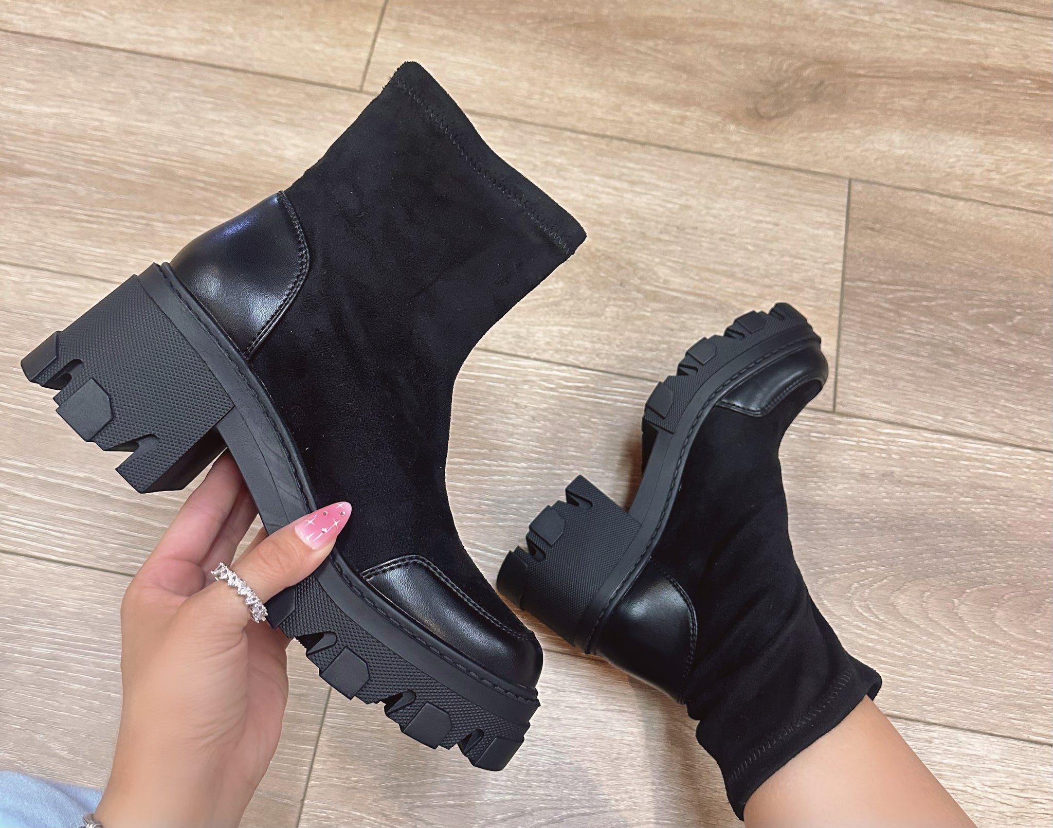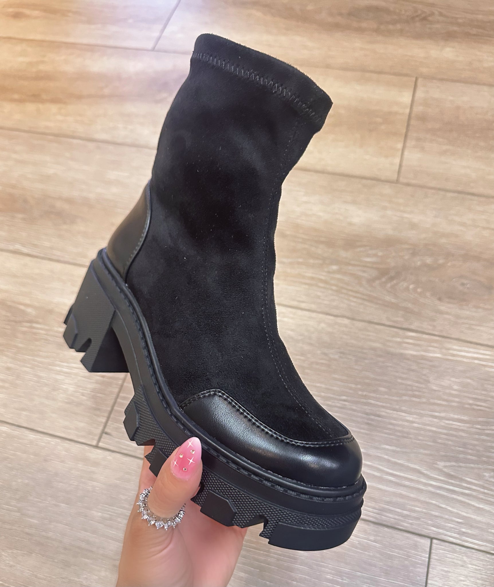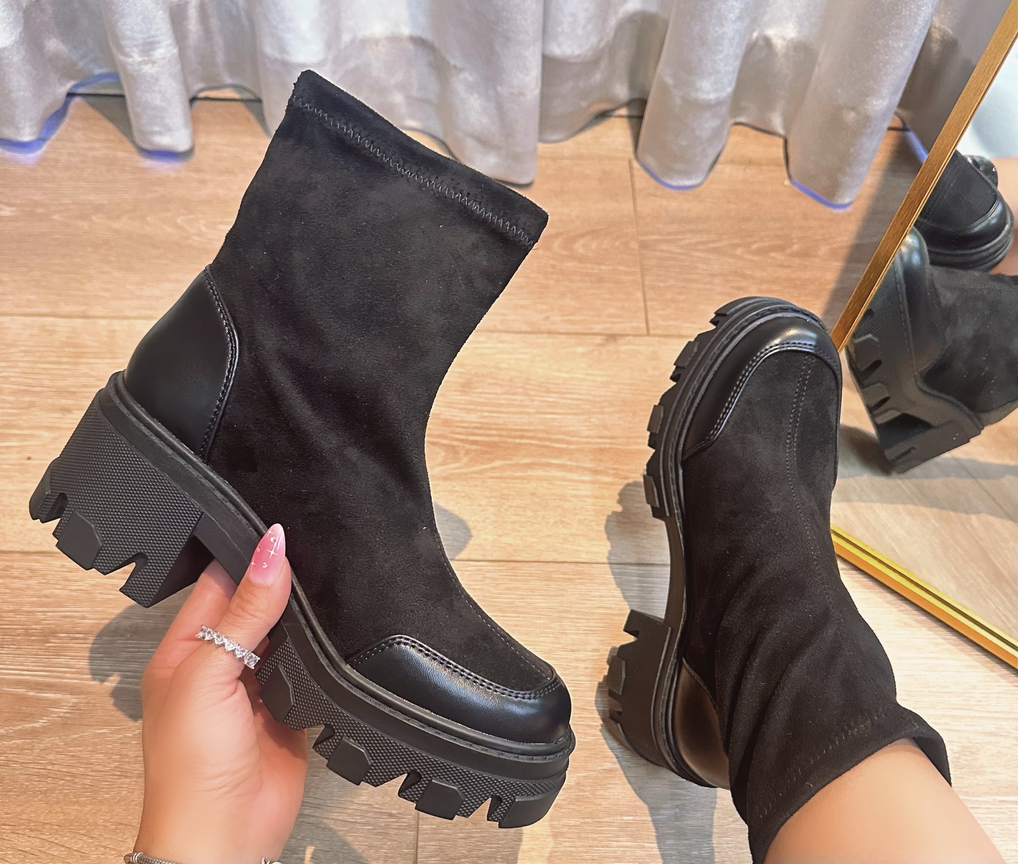 This stylish boot features a stretchy ankle design and a chunky sole for added comfort. Made with PU material, it has a sleek black color and a 3 inch heel height.