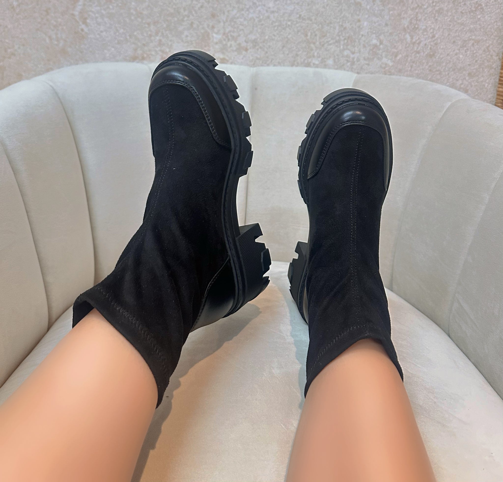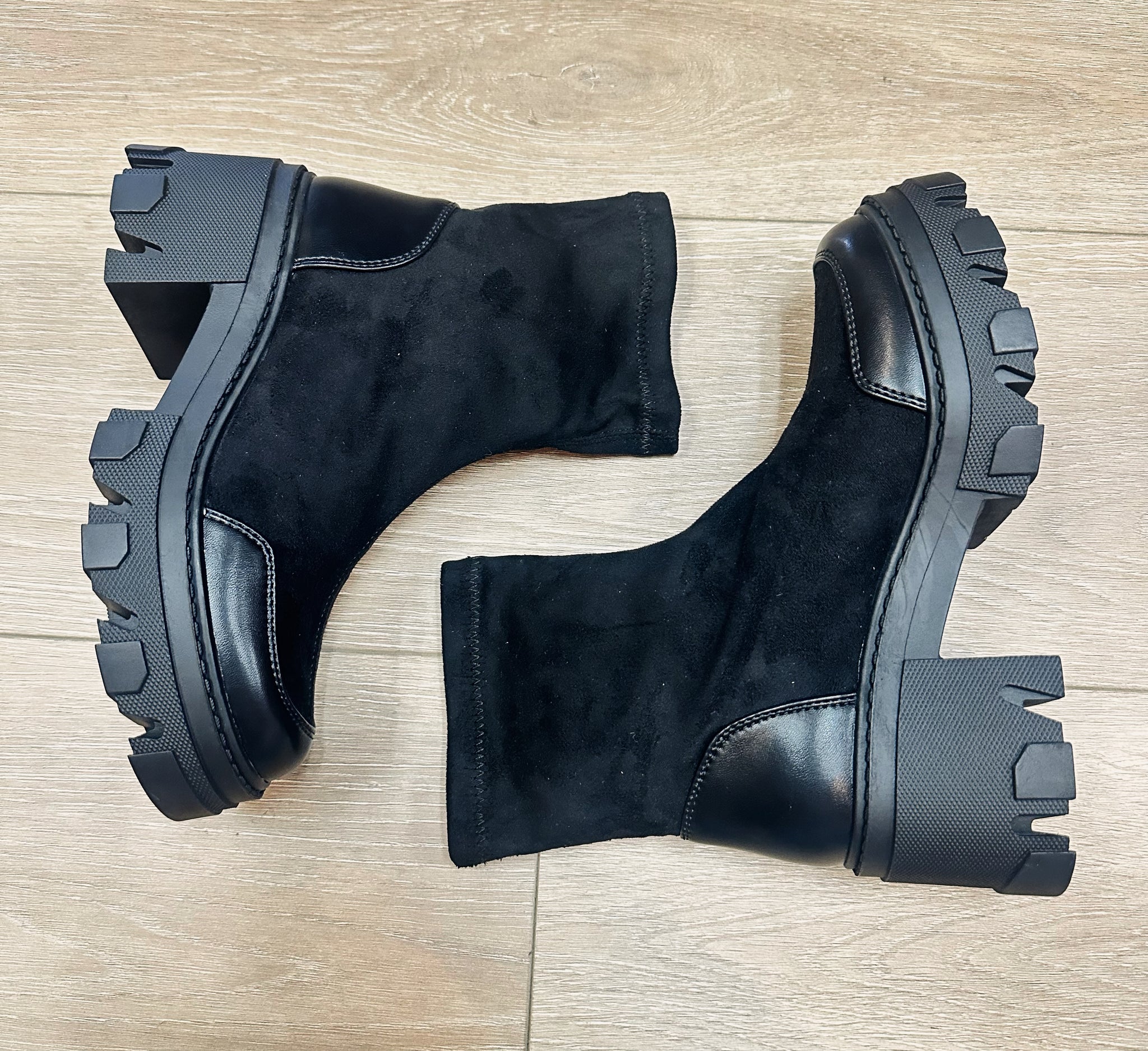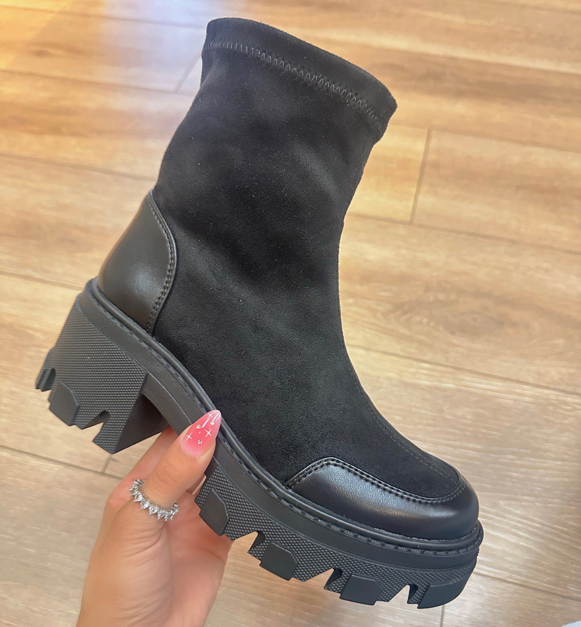 This stylish boot features a stretchy ankle design and a chunky sole for added comfort. Made with PU material, it has a sleek black color and a 3 inch heel height.