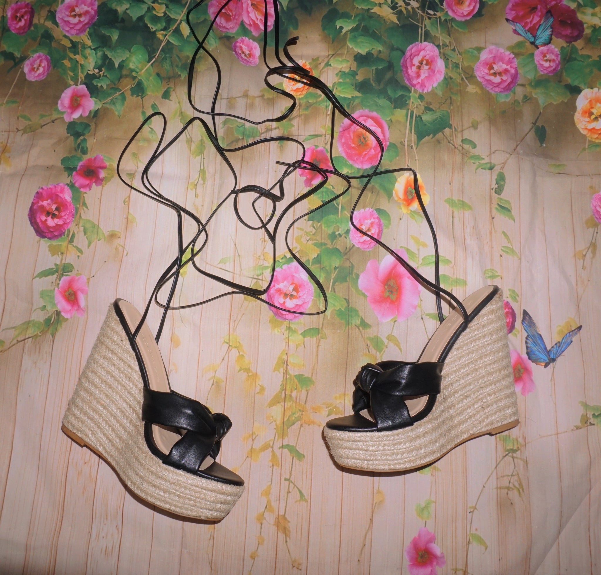This stylish wedge stands at 4.5 inches tall, making it a versatile choice for any outfit. The open toe design and lightly padded insole provide comfort, while the criss cross detail on the front strap adds a unique touch. The espadrille platform wedge comes in black and is true to size.