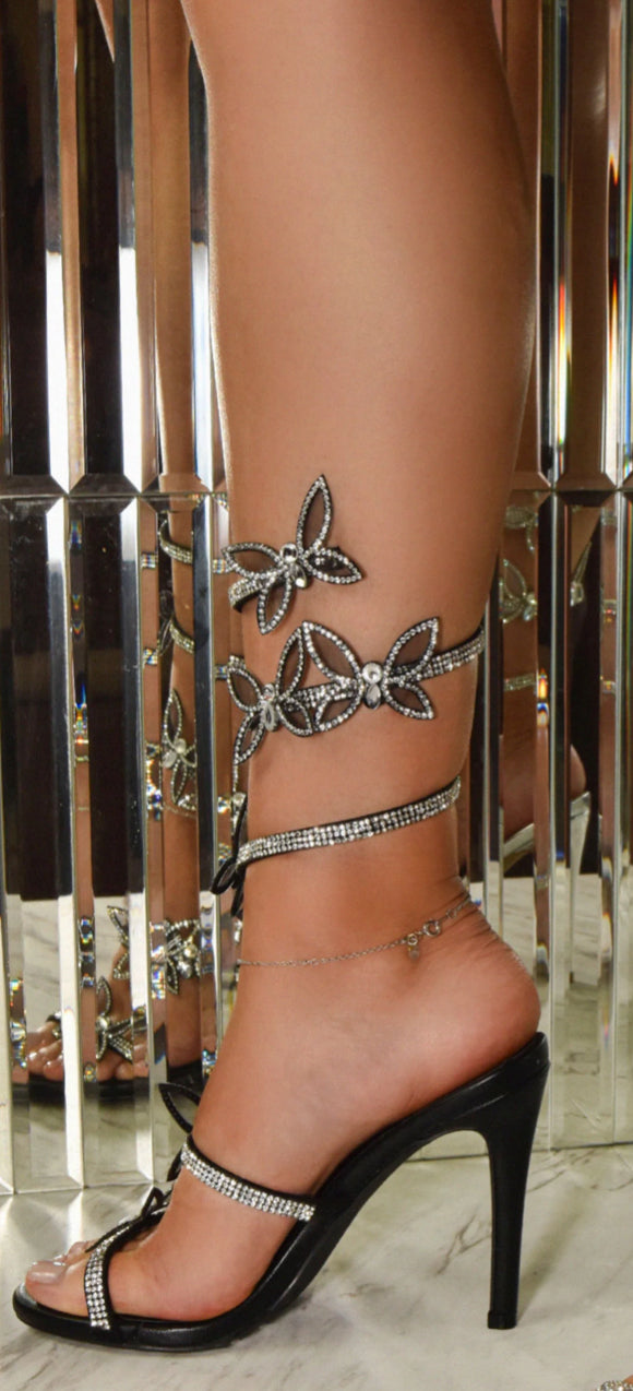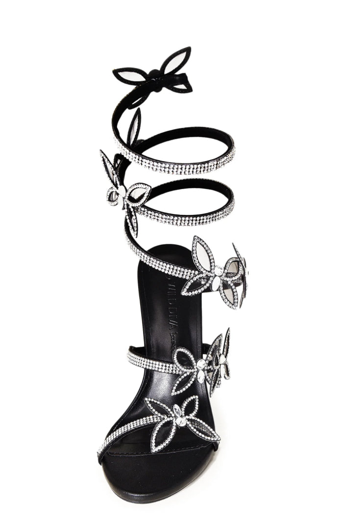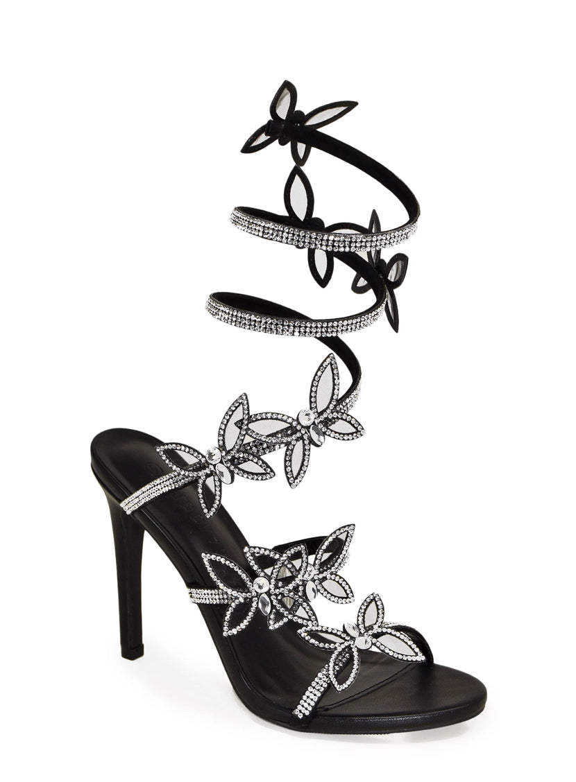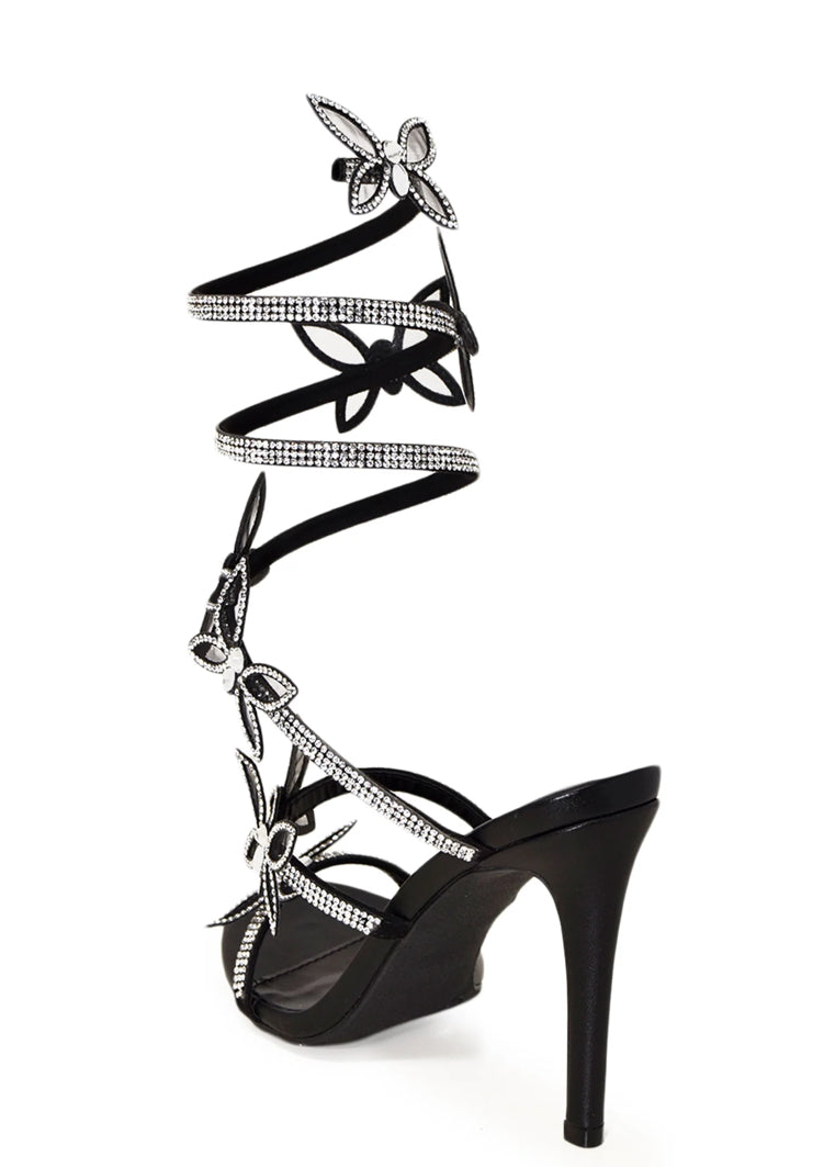 Gleaming rhinestones decorate the winding straps of these dazzling butterfly-silver detail open round-toe heel. Heel Height is approximately 4.25 inches, with a black single sole heel that is true to size.
