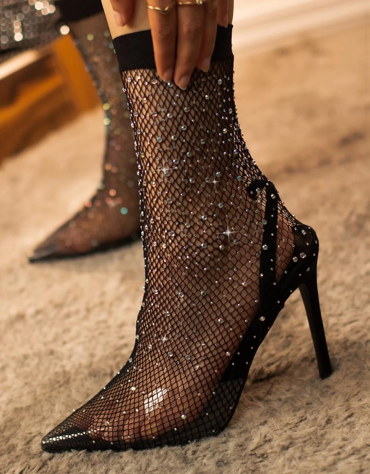 These glamorous pump heels feature a 4.25 inch heel with a wrapped-like design, adorned with shimmering rhinestones and a single sole with a black and silver color combination. They are true to size.