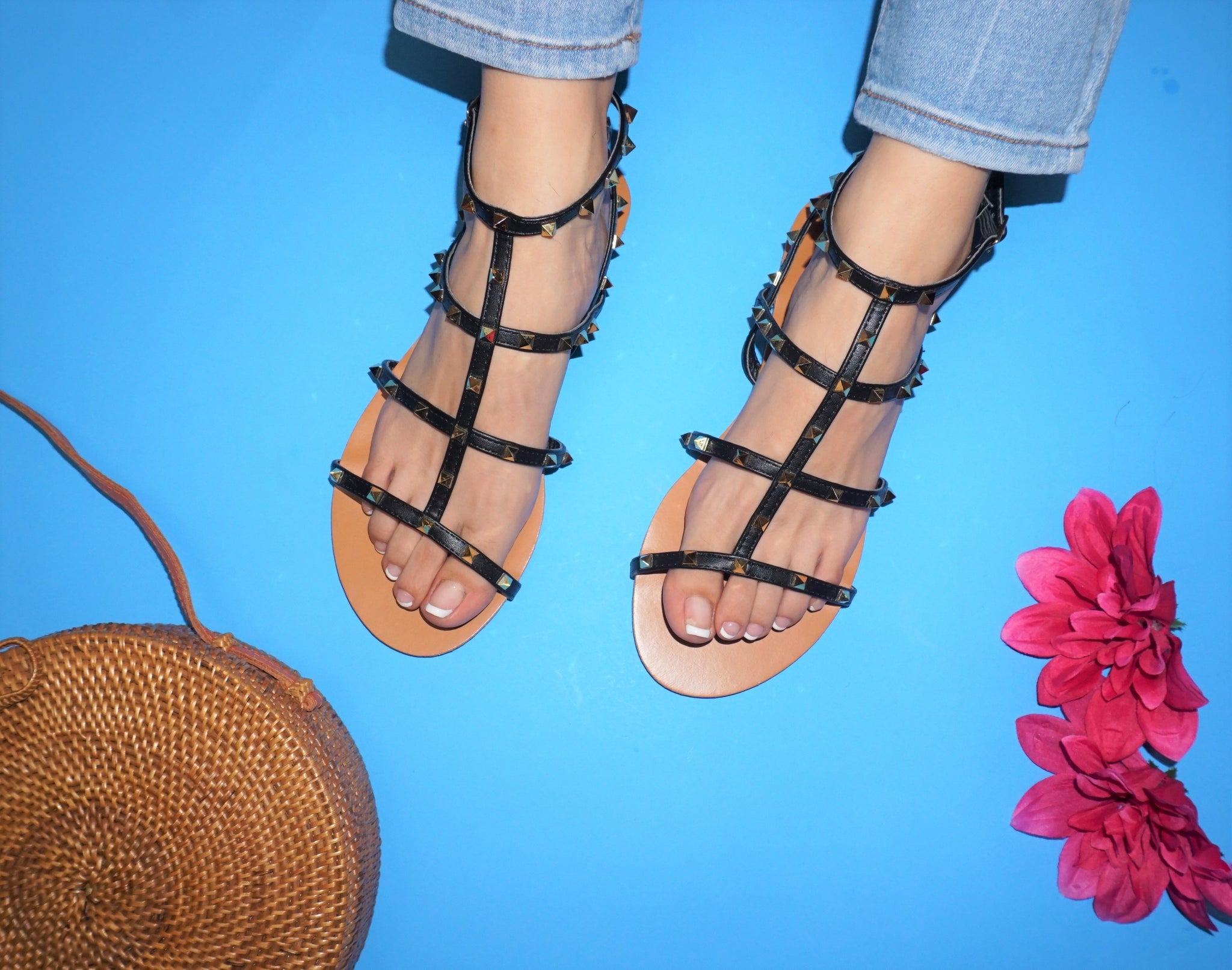 Around The Ankle Buckle Closure Open toe Lightly Padded Insole Gold Stud Detail Black Sandal True to Size